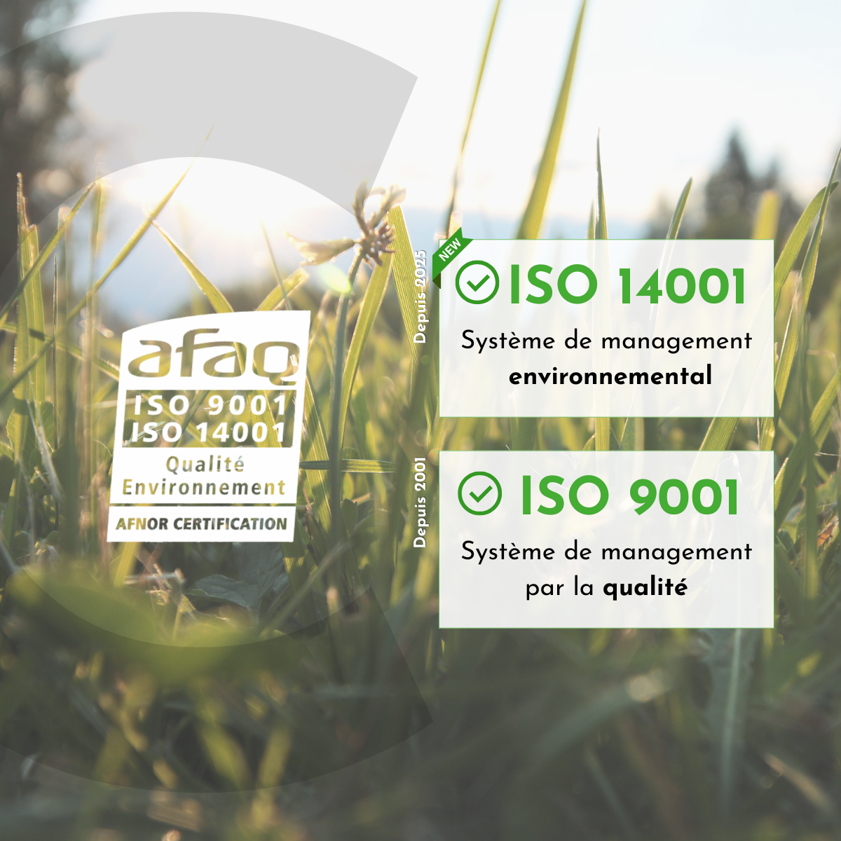 Le renouvellement de la norme ISO 9001 et la certification ISO 14001 confirment notre volonté de progresser dans le temps et d’améliorer continuellement nos pratiques en matière de qualité et d’environnement.
