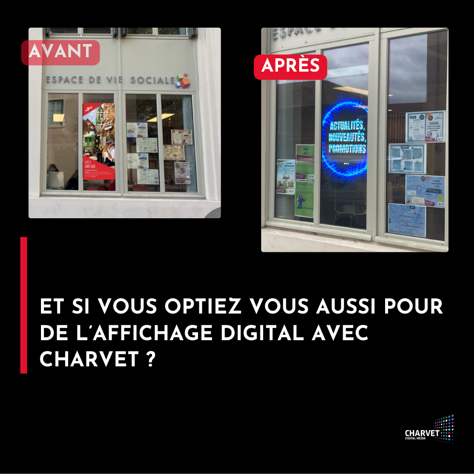 Vous souhaitez moderniser la communication de votre structure, de votre commerce, de votre entreprise ou de votre commune ? Les solutions d’affichage dynamique proposées par Charvet Digital Media permettent de diffuser efficacement vos informations, valoriser vos offres ou activités et capter l’attention de votre public. Que vous soyez une collectivité, une association, un commerce, une grande surface, une entreprise ou un établissement accueillant du public, l’affichage digital est un outil puissant pour communiquer de manière claire, moderne et impactante.